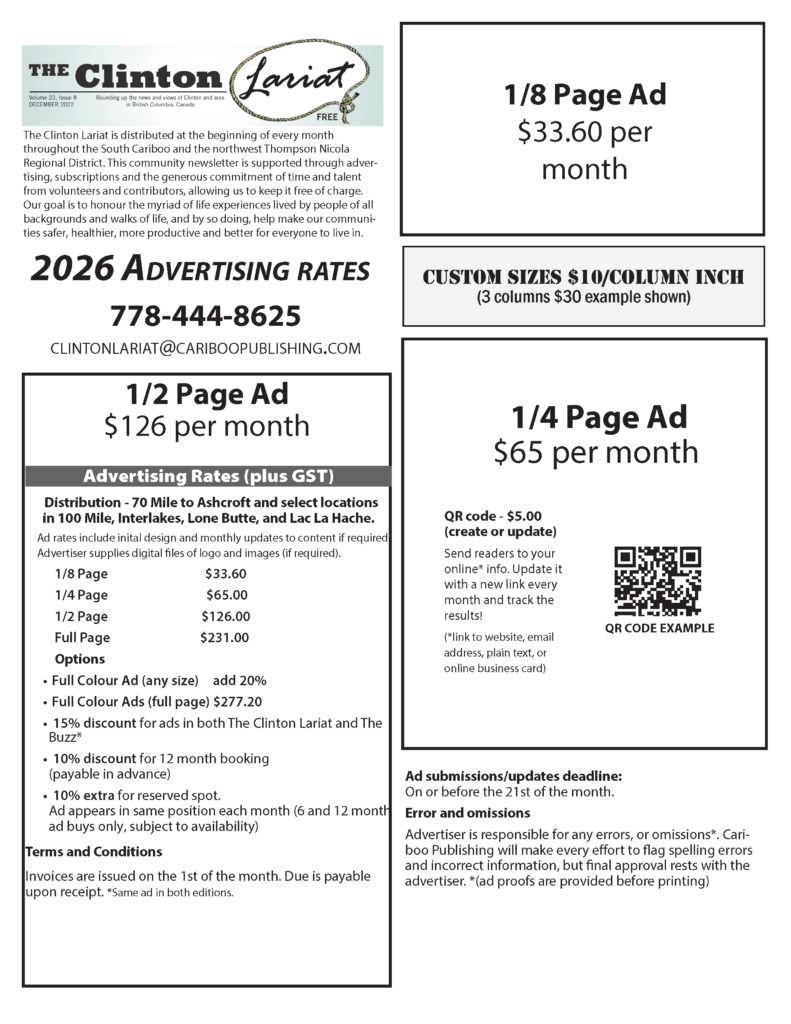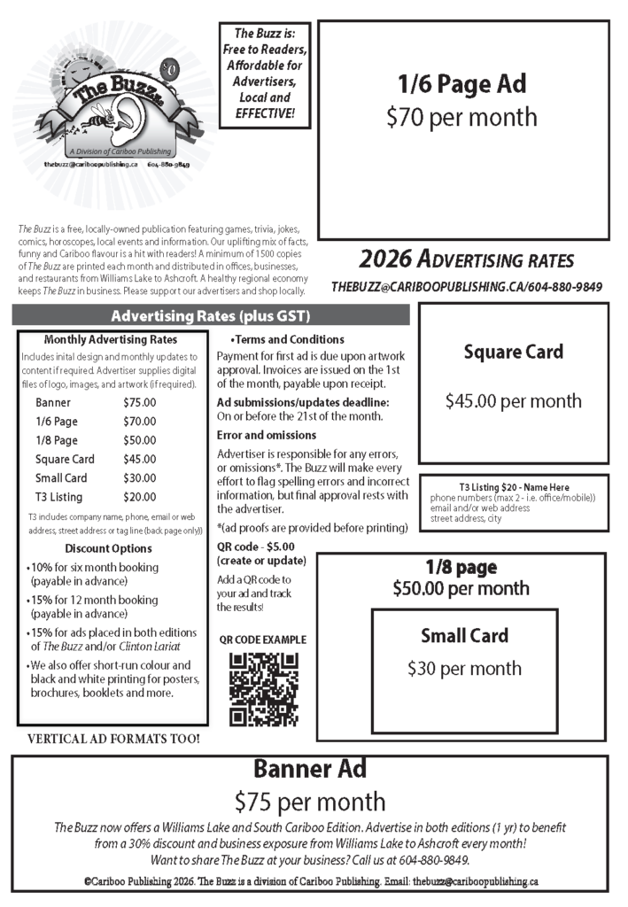 Our monthly free publications The Buzz and the Clinton Lariat reach thousands of Cariboo residents and visitors every month — with locally-focused information and entertainment people love to read. Our broad distribution across the South Cariboo and competitive ad rates make us a cost-effective advertising choice for those with a limited marketing budget.
